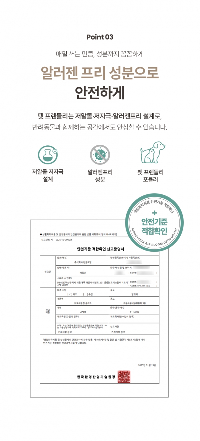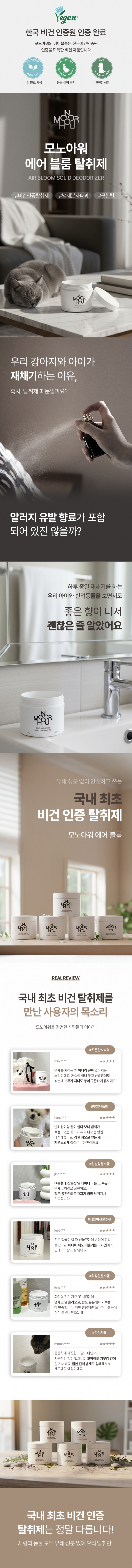 이제 방향제도 똑똑하게 선택해야 할 때입니다. 단순히 강한 향으로 냄새를 덮는 것이 아닌, 냄새의 원인 분자를 흡착→중화→분해하는 과학적인 탈취. 한국비건인증원에서 비건 인증을 완료한 제품으로, 동물성 원료와 동물실험을 배제한 안전하고 지속가능한 생활 탈취제입니다. 펫 프렌들리·저자극 → 체험 제품은 펫프렌들리 제품으로 알레르기 물질이 포함되지 않아 아이, 반려동물이 있는 공간에서도 안전하게 사용 가능 모노아워 고체탈취제를 직접 사용해보고, 99% 탈취력의 효과와 안전성을 생활 속 후기로 자연스럽게 공유해 주세요. 많은 신청 부탁드립니다 |